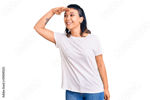 Young woman wearing casual clothes very happy and smiling looking far away with hand over head. searching concept.