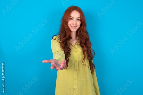 young woman wearing green shirt over blue background smiling cheerful offering palm hand giving assistance and acceptance.