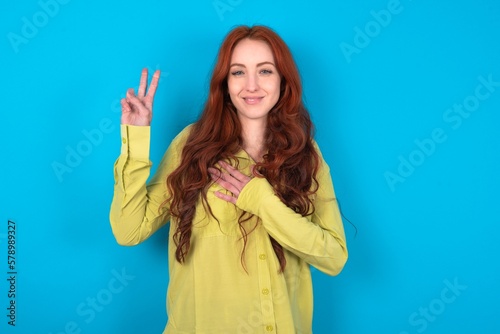 young woman wearing green sweater over blue background smiling swearing with hand on chest and fingers up, making a loyalty promise oath.