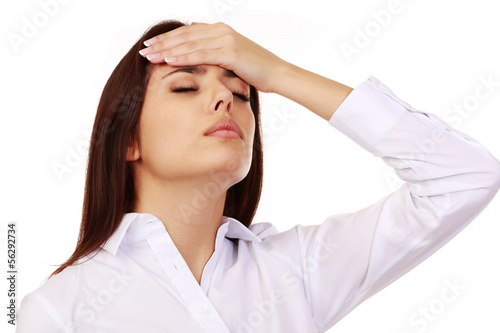 young woman with a headache isolated on white