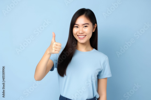 young woman with a joyful smile and a relaxed posture, signaling the OK symbol with her fingers. She is dressed in casual, creating an approachable and relatable image. Generative AI Technology