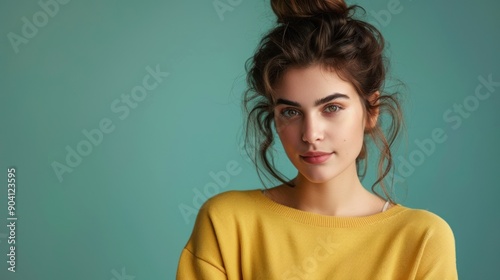 Young woman with an embarrassed expression standing against a solid studio background.