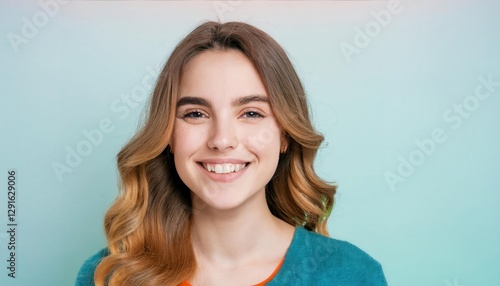Young woman with beautiful hair displays a cheerful smile, emphasizing dental care and wellbeing.