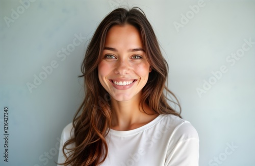 Young woman with beautiful smile poses in front of gray studio backdrop. Attractive female model displays natural beauty. Studio portrait captures happiness, positive emotion. Casual white top