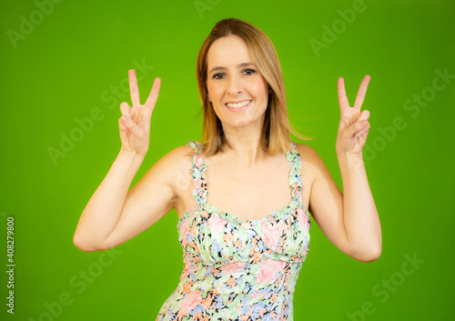 Young woman with blonde hair posing in studio over green background showing victory sign
