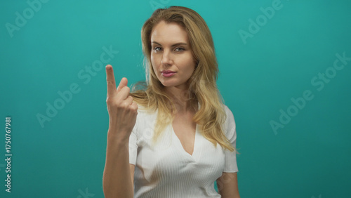 Young woman with blonde hair shows a counting gesture with fingers on a green background celebrating and smiling energetically.
