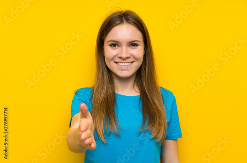 Young woman with blue shirt handshaking after good deal