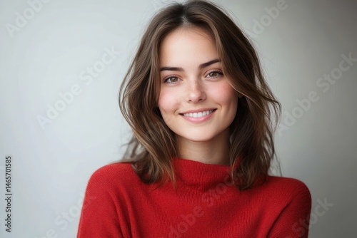 Young woman with brown hair smiling warmly wearing a red sweater against a light plain background