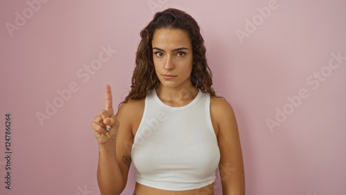 Young woman with brunette hair and wearing a white tank top making a gesture with her index finger raised, standing against a pink background