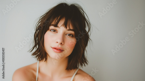 Young woman with brunette messy bob hairstyle portrait with copy space