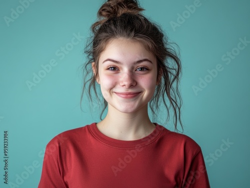 Young Woman with Casual Bun and Red Shirt Smiling. Generative AI.