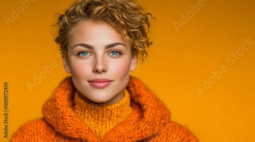 Young woman with curly blonde hair and blue eyes wearing an orange sweater