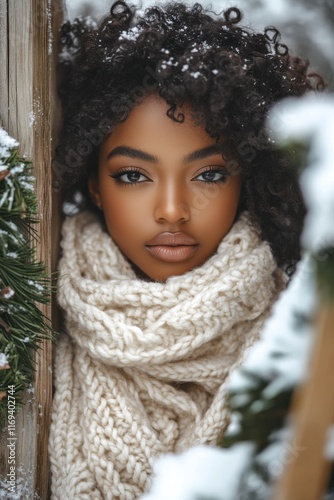 Young woman with curly hair dressed in warm clothing gazing softly amidst a snowy winter backdrop, surrounded by green foliage and wooden elements at a cozy outdoor location