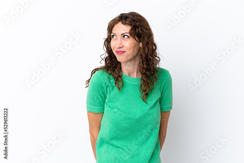 Young woman with curly hair isolated on white background having doubts while looking up