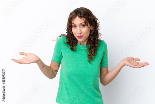 Young woman with curly hair isolated on white background having doubts while raising hands