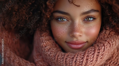 Young woman with curly hair smiles warmly while wearing a thick knitted scarf in a cozy outdoor setting