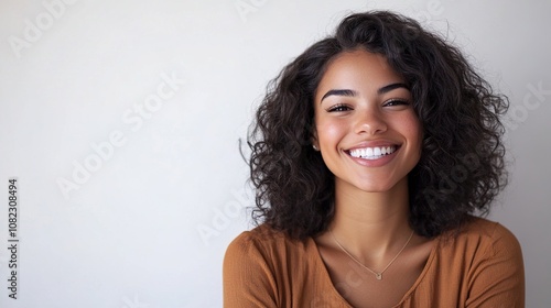 Young Woman with Curly Hair Smiling Radiantly Against a Light Background, Emphasizing Natural Beauty and Confidence in a Modern Setting
