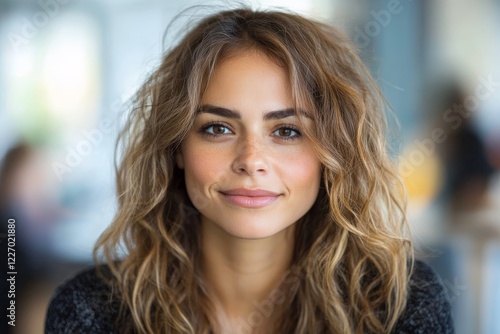 Young woman with curly hair smiling warmly in a bright cafe setting in the afternoon