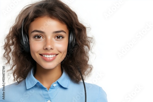 Young woman with curly hair smiling while wearing headphones in a bright setting. Generative AI