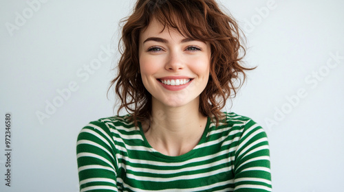 Young woman with curly hair wearing a striped shirt smiles warmly against a plain background