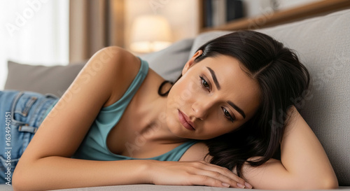 Young woman with dark hair lying on sofa, pensive expression, wearing teal top and jeans, showcasing sadness or contemplation