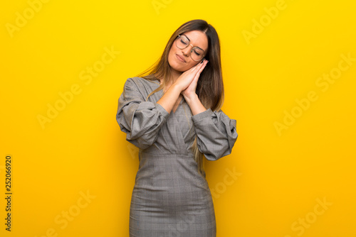 Young woman with glasses over yellow wall making sleep gesture in dorable expression