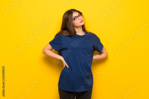 Young woman with glasses over yellow wall suffering from backache for having made an effort