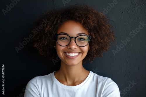 Young Woman With Glasses Smiling Brightly Against Dark Background in Indoor Setting