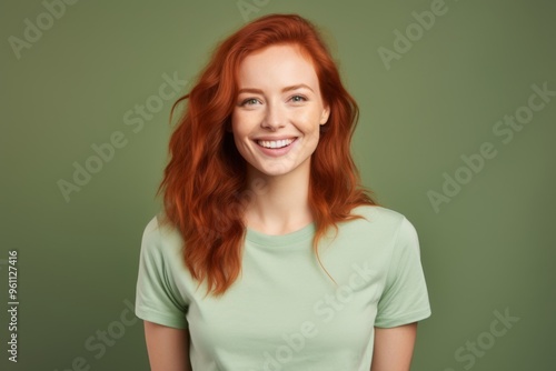 Young woman with green eye patches on her face, isolated against a beige background. Close-up portrait of a ginger-haired girl wearing a T-shirt and looking away while smiling, applying a cosmetic gel