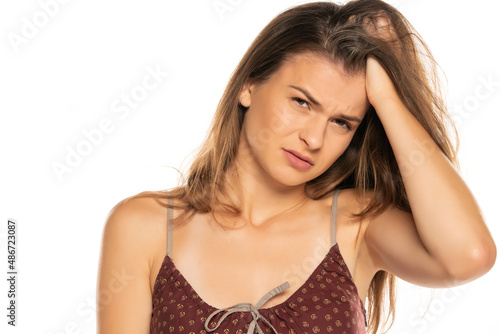 Young woman with headache, isolated on white.