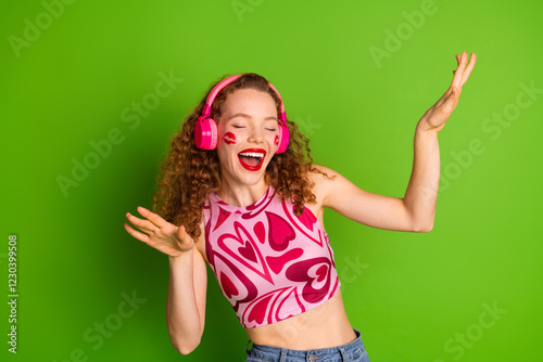 Young woman with headphone enjoying music in colorful attire against vibrant green background