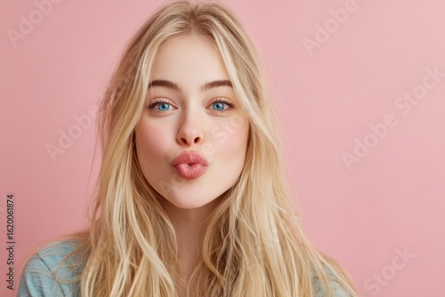 Young woman with long blonde hair and blue eyes making a kissy face against a pink background