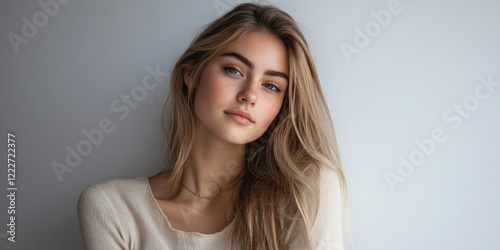 Young woman with long blonde hair in cream long sleeve shirt posing sideways against a soft white backdrop, gazing thoughtfully at the camera.