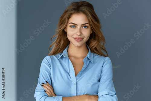 Young Woman With Long Brown Hair And Blue Eyes Smiling Wearing Light Blue Button-Up Shirt Standing With Arms Crossed