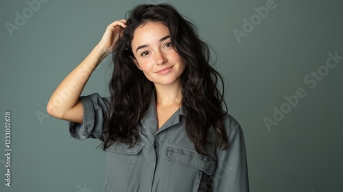 young woman with long dark hair and gray shirt, posing against a muted green background