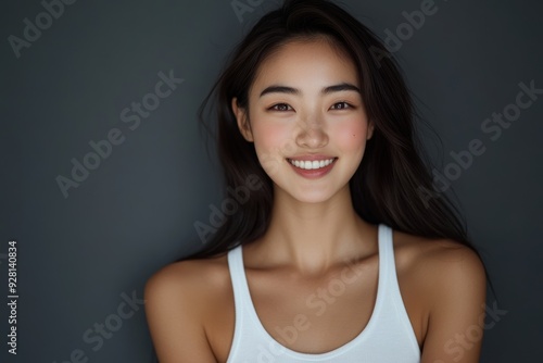 young woman with long, dark hair poses confidently in a bright, minimalist studio. Her radiant smile and natural beauty are emphasized by the simple white outfit she wears.