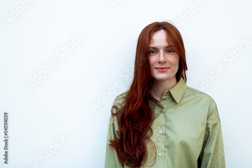 Young woman with long ginger hair outdoors in city. Young woman face with freckles