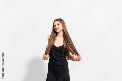 Young woman with long hair expresses joy while posing in a black dress against a white background