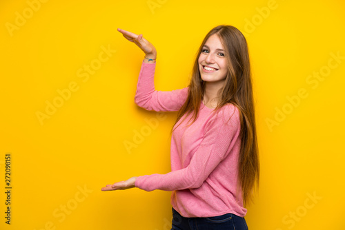 Young woman with long hair over isolated yellow wall holding copyspace to insert an ad