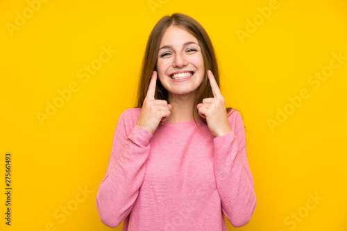 Young woman with long hair over isolated yellow wall smiling with a happy and pleasant expression