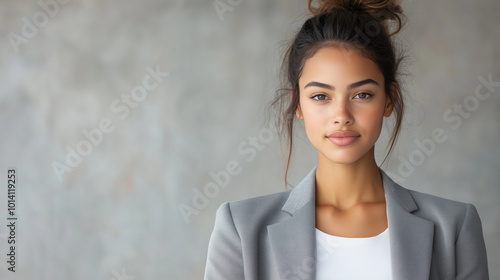 young woman with long hair poses against textured concrete wall. Her expression is calm and serene, capturing moment of quiet beauty.
