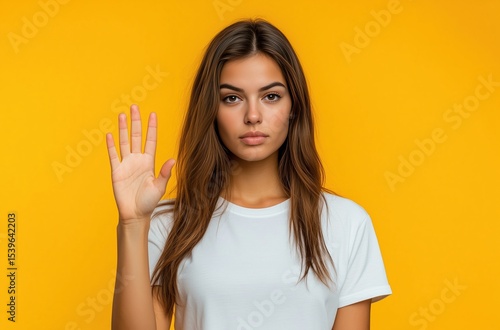 Young woman with long hair raises hand against bright yellow background in a casual setting
