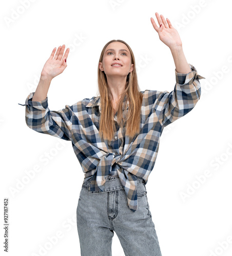 Young woman with long hair smiling and raising her hands, wearing a plaid shirt and jeans, isolated on a white background. Clean cutout template