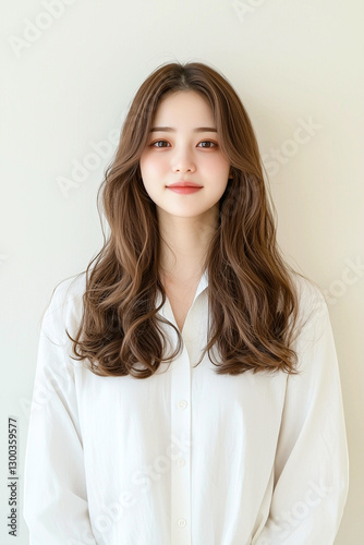 Young Woman with Long Wavy Brown Hair Wearing a White T-Shirt