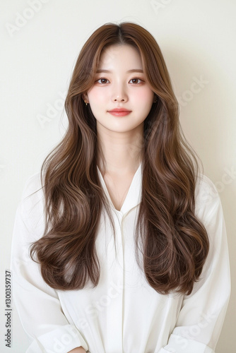Young Woman with Long Wavy Brown Hair Wearing a White T-Shirt