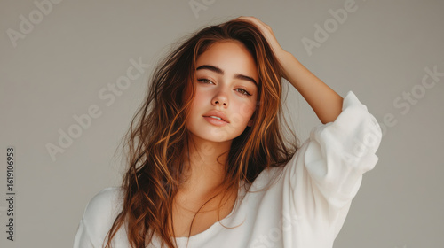 young woman with long, wavy hair poses gracefully in soft white sweater, exuding relaxed and confident vibe.