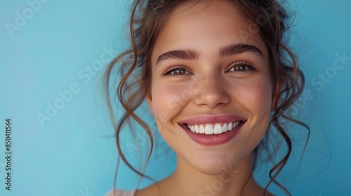 Young woman with perfect healthy pearly white teeth smile. Health, teeth whitening, dental care, dentistry, stomatology concept