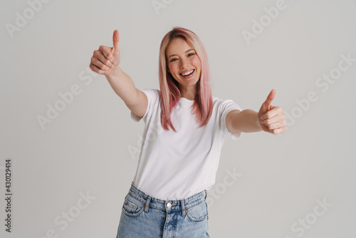 Young woman with pink hair smiling and gesturing thumb up