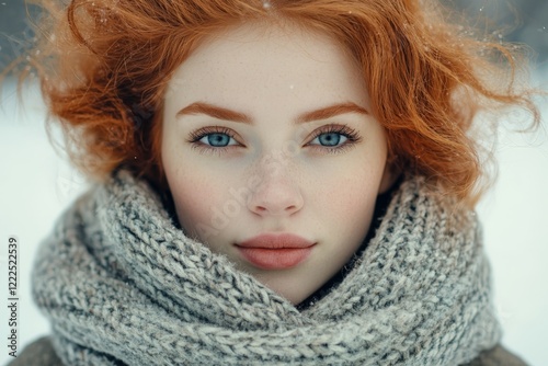 Young woman with red hair and blue eyes wearing a cozy scarf in a snowy outdoor setting during winter
