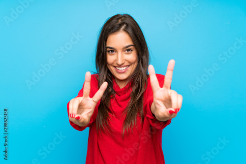 Young woman with red sweater over isolated blue background smiling and showing victory sign